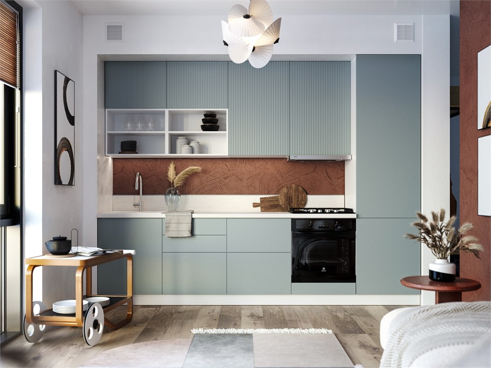 Природные оттенки и сочетание разных фактур делают кухню уникальной. Глубокий серый "Монблан", серо-бежевый "Атласный серый", белый "Айленд силк" и приглушенный сине-зеленый "Мисти-грин" – идеальные цвета для кухни.